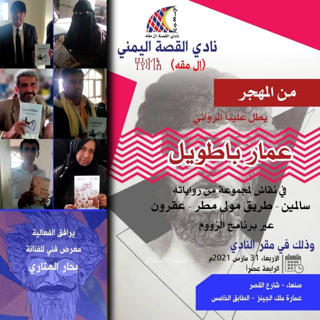 يحتفي نادي القصة اليمني إل مقه بالكاتب والروائي عمار باطويل، من خلال مناقشة روايات (سالمين – طريق مولى مطر – عقرون)، وتقديم قراءات من قِبل عدد من أعضاء النادي.