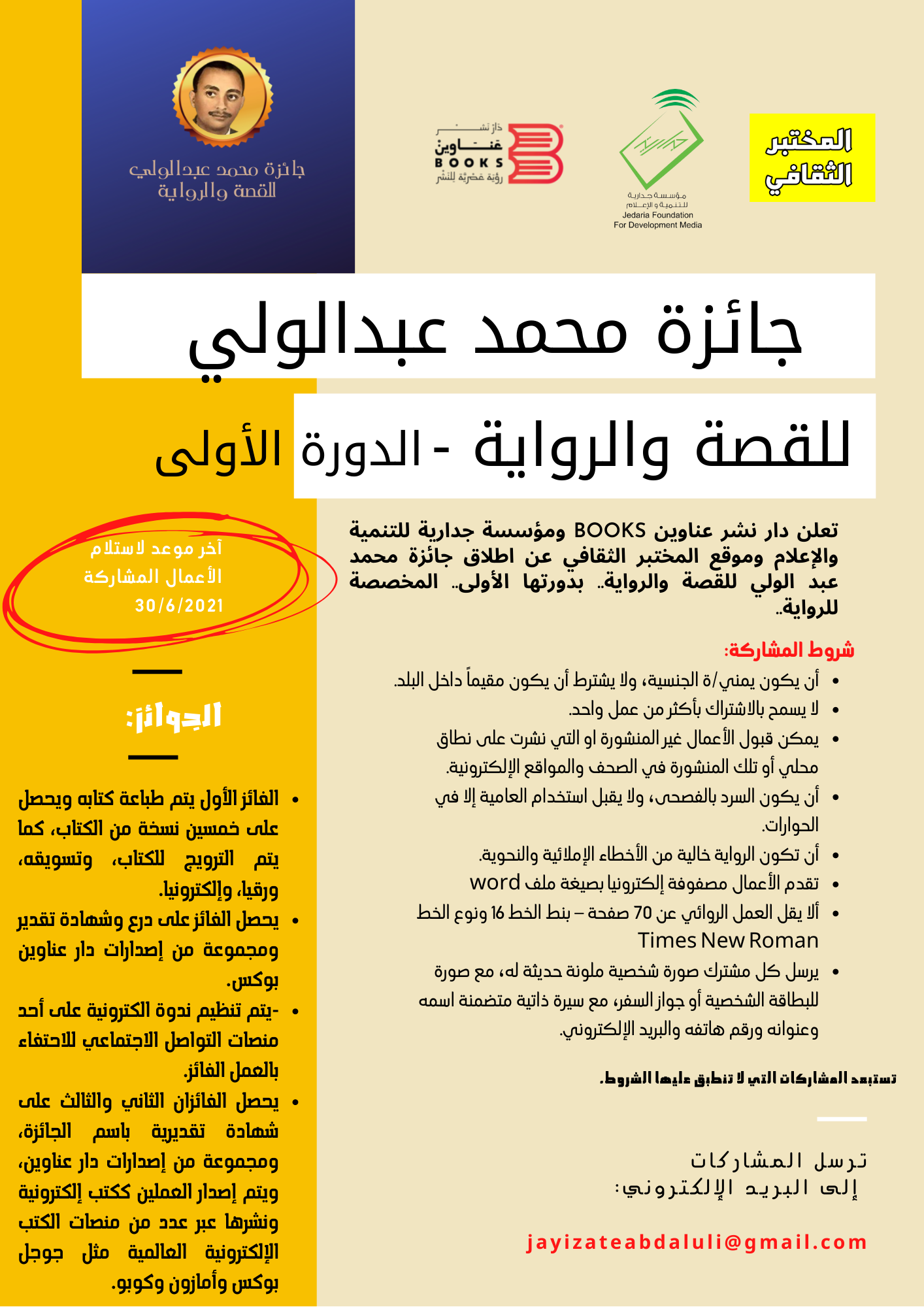 تعلن دار نشر عناوين BOOKS ومؤسسة جدارية للتنمية والإعلام وموقع المختبر الثقافي عن اطلاق جائزة محمد عبد الولي للقصة والرواية.. بدورتها الأولى.. المخصصة للرواية..