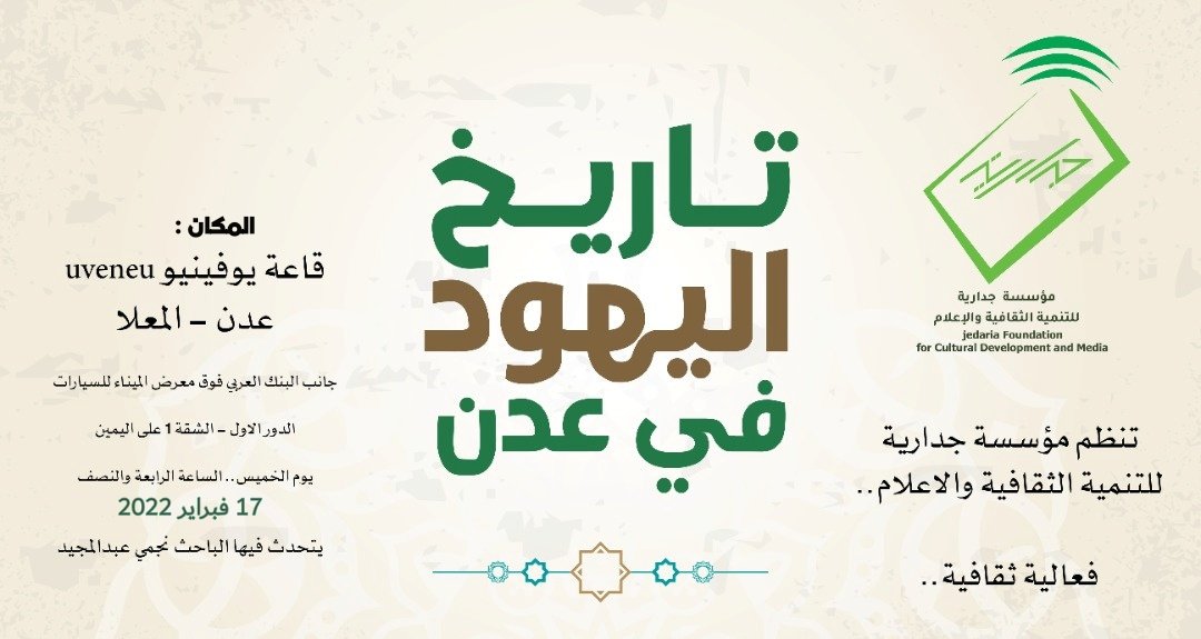 تنظم مؤسسة جدارية للتنمية والاعلام فعالية ثقافية حول تاريخ اليهود في عدن يتحدث فيها الباحث الأستاذ نجمي عبدالمجيد.